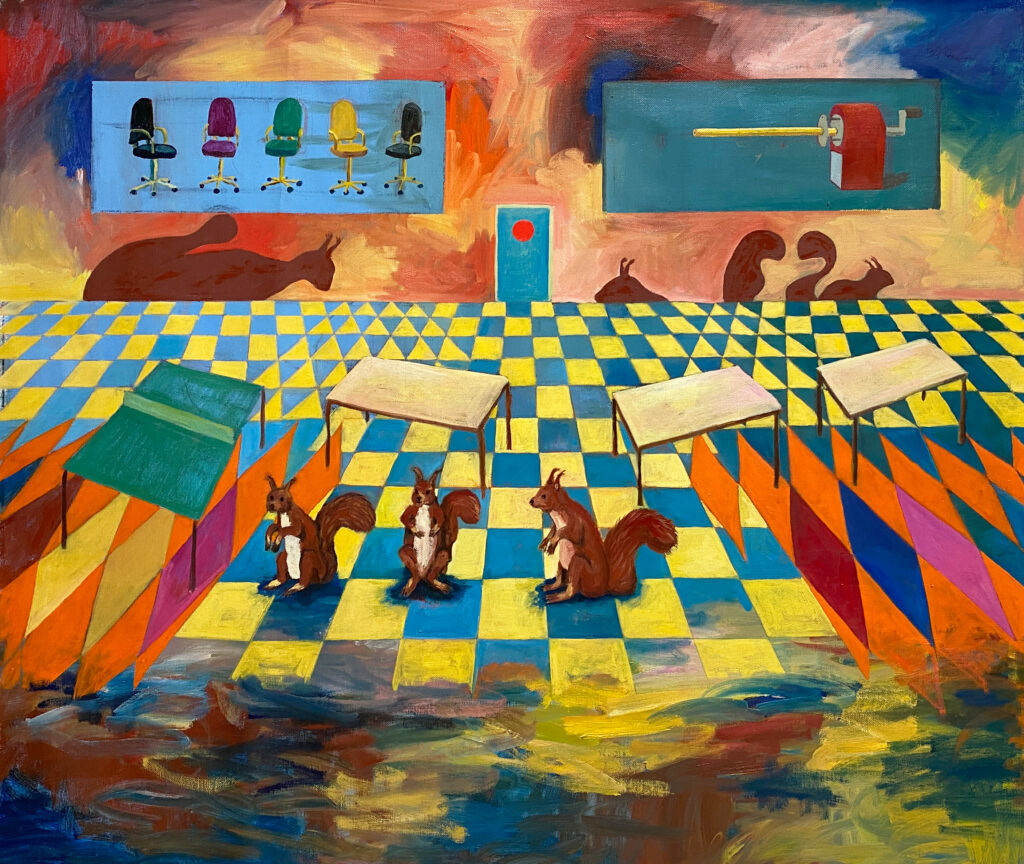 Squirrells in Office, 110 x 95 cm , oil on canvas, 2026